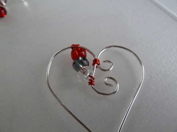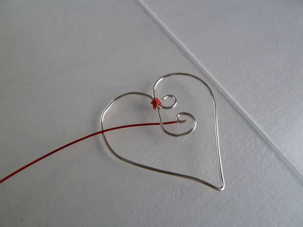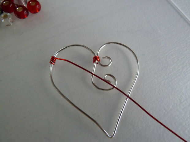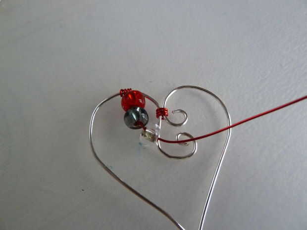 Empezar por enrollar un trozo de alambre de color alrededor del exterior del corazón. Añadir tus cuentas y pasar el cable hasta que coloca en algún lugar te guste. Para finalizar esta parte, enrolle el extremo del alambre alrededor de la parte del corazón de alambre donde los granos terminan y cortarlo.