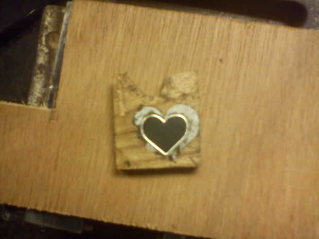 Cuando el corazón de plata se adapta, de manera que quede al ras con la superficie del corazón, es el momento de pegarla en. He usado epoxy de dos componentes. Tome un pedazo de madera y colóquelo en la parte posterior de su pronto a ser colgante. Luego poner en una fina capa de epoxi, no tanto que se desborda y consigue desordenado, y poner el corazón de plata. Debe obtener desordenado, asegúrese de poner un pedazo de papel para hornear sobre el corazón de plata, antes de colocar otro pedazo de madera sobre toda la cosa. Luego asegurar la cosa entera en un tornillo de banco y dejarlo toda la noche.
