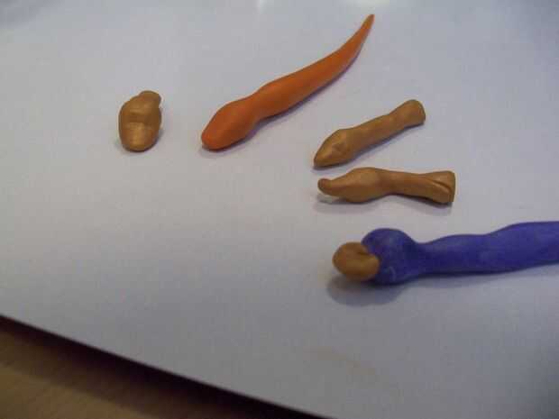Empezar con el trabajo de la arcilla en una bola del tamaño del cuarto. Que tenga a amasar por un tiempo tenerlo suave. Empezar a rodar la pelota en un cilindro. Estirar por lo que es de unos 15 cm de largo con un extremo más grande y la otra muy pequeña. A continuación, utilice un dedo para hacer una arboleda alrededor del extremo más grande la distancia desde el extremo que desee la cabeza para ser. Lo último en este paso es formar la cabeza. Hay muchos estilos probar unos hacia fuera para encontrar el que más te guste. Hacer dos pequeños guiones donde van los ojos.