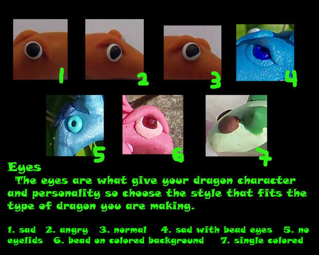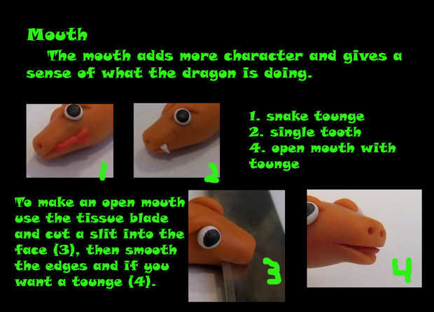 La cara es la parte del dragón que le da la personalidad, así que tome mucho tiempo lo que es correcto. Los ojos a veces pueden ser difíciles hacer bien porque son pequeñas y necesita hacer dos que tienen el mismo aspecto. Si no desea ocuparse de hacer ojos que usted puede conseguir alrededor de él con el uso de mostacillas de vidrio. Pero a lo ojos, lo primero es obtener trozos pequeños de piezas blancas y más pequeñas de color negro. La mejor manera de hacer esto es rollo de blanco y negro y luego utilizar la hoja de tejido a cortar. Estas piezas del rodillo en bolas y aplastarlos juntos. Usted puede hacer los ojos con diferentes colores o inverso les. Colocarlos ligeramente en la cabeza para encontrar donde van. Lo siguiente es hacer las cejas. Hacer que dos pequeños cilindros y tapper los extremos. Colóquelas sobre los ojos. Lío con ellos por un tiempo porque dan su dragón más emoción. La siguiente característica de este paso es hacer la nariz. Esto es muy sencillo de hacer, sólo tiene que utilizar una selección de diente para hacer dos agujeros. La boca es la última cosa que hacer en este paso. Simplemente ruede una selección de diente en la parte delantera de la cabeza para formar una ranura. Añadir cualquier características como dientes o lenguas.