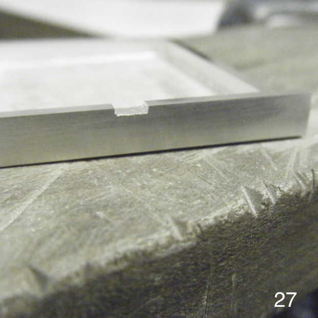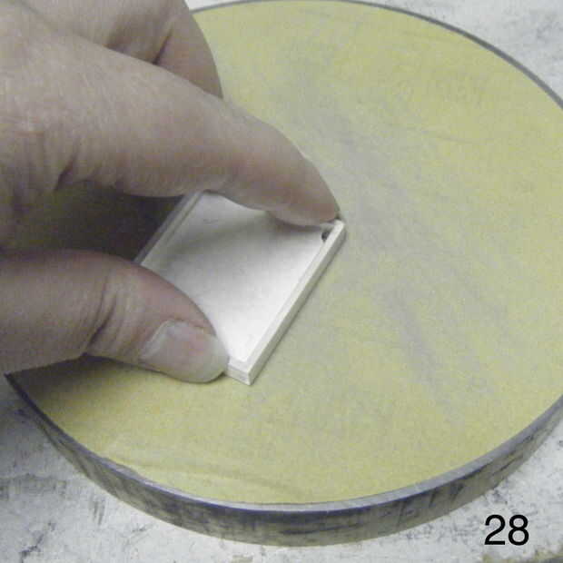 Antes de soldar el gancho para el esmeril de marco el borde posterior del marco de la ras y liso, a partir de esmeril 220 a través de 100, 400, 600, 1200, 1500 granos. Es mucho más fácil conseguir en el borde posterior de la estructura antes de que la fianza se suelda en la (imagen 28). Me gusta utilizar un bloque de acero con papeles de esmeril adherentes del uno mismo pero un poco de pegamento de aerosol obras agradables, sólo asegúrese del que bloque de acero es muy suave; el bloque se puede lijar suave con una lijadora de Palma a partir de esmeriles de curso y hasta suave, grano 220 es lo suficientemente suave.