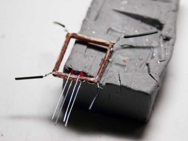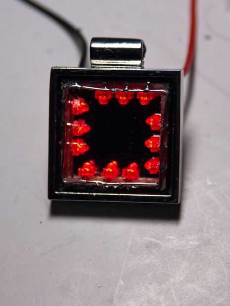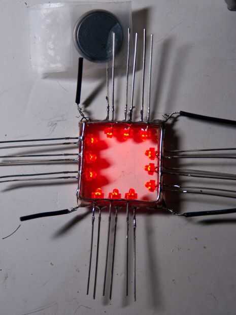 Soldar un cable en el marco de la placa de circuito. El otro cable para el alambre de la soldadura. Ahora que todo está conectado, nos podemos cortar todos los cables que sobresalen y el alambre extra (la esquina porciones de cable de conexión). Utilice el cortador de alambre para cortar el las porciones innecesarias. Prueba a ver si la configuración de LED se ajusta dentro de la botonera. Asegúrese de que hay un poco de espacio extra para la cinta aislante. Si no se ajusta a la configuración del LED, usar el papel de lija, archivo, o Dremel y cortador de alta velocidad en las partes soldadas, desgastando al estar tan cerca del placa de circuito/cable como sea posible. Cuando termine, cortar una fina pieza de cinta aislante y enróllelo alrededor del marco de la placa de circuito. Probar si el marco con la cinta todavía cabe en el colgante. Si no, retire la cinta y volver a utilizar el papel de lija, archivo o Dremel. Cuando la configuración de LED se ajusta en el colgante, se conectan a una batería y asegúrese de que todos los LEDs funcionan correctamente. Si alguno se quema, retire la cinta, soldadura en nuevo LED (lijado/presentación/usando el Dremel como sea necesario). La cinta se utiliza para asegurarse de que los cables de LED no entren en contacto con las paredes de la botonera.