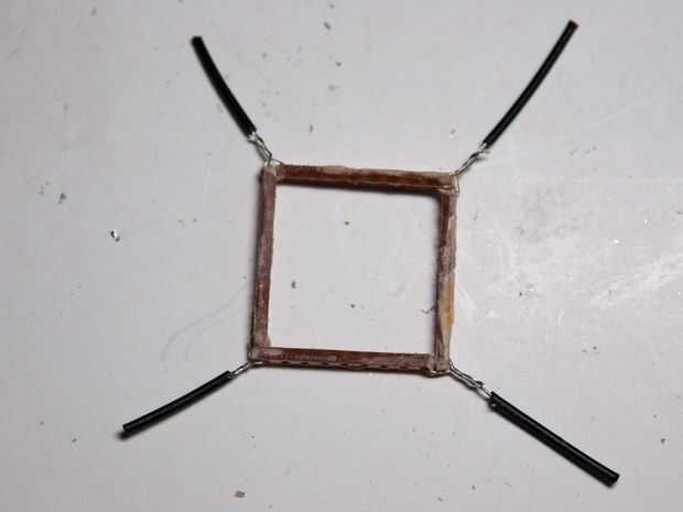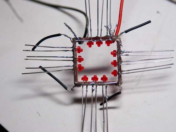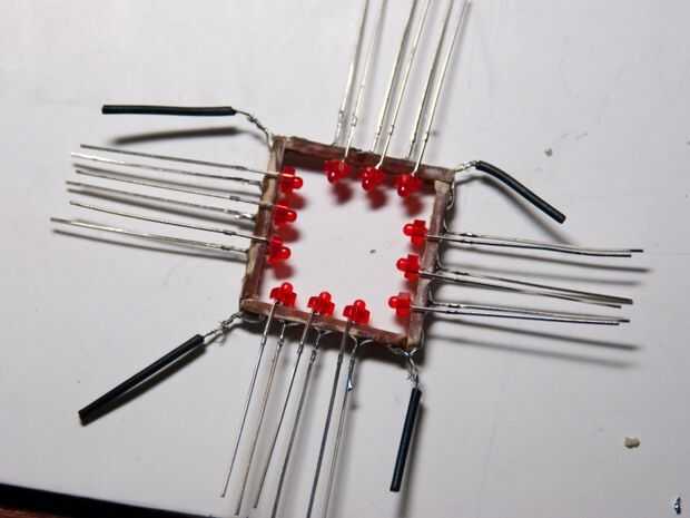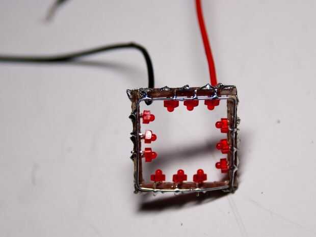 Cada LED tiene dos cables, uno ligeramente más largo que el otro. El cable más largo es el positivo y el cable más corto es el cable negativo. Para el colgante, se conectan los LEDs en paralelo (todos positivo lleva conectado y todos los negativos lleva conectado). Elija si desea lo positivo lleva conectado con el marco de la placa de circuito o el negativo lleva conectado.