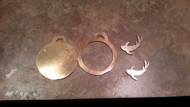 La placa trasera y el marco fueron cortadas de lámina calibre 16 de bronce, y los peces fueron cortados de calibre 16 plata alemana. Cuando corte metal grosor 16 calibrador con un joyeros vi que recomiendo no cortar las piezas de la hoja durante el mayor tiempo posible. El material adicional te dará un mucho mejor agarre y guarde tus manos.