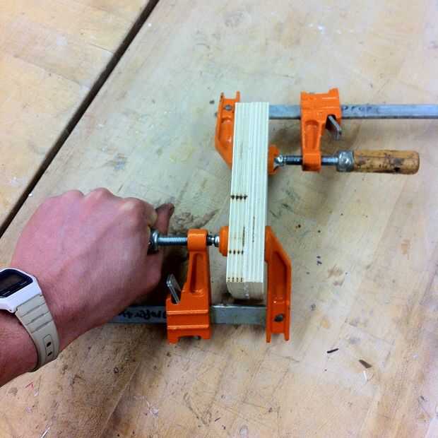 Corte tres piezas de madera contrachapada de media pulgada a cerca de tres por cuatro pulgadas. La medida exacta no es importante pero permanecen constantes.