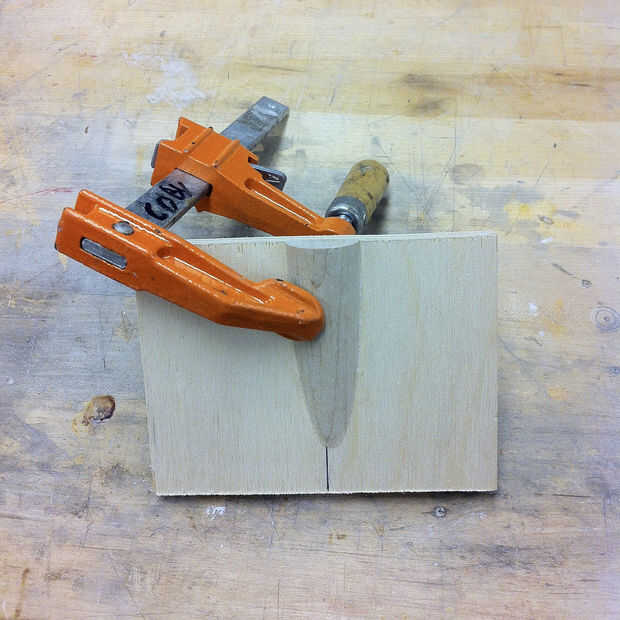Con la lijadora spinde tallar hacia fuera un canal angulado en la pieza de madera contrachapada de doble grosor. Este canal debe ir desde la parte superior a aproximadamente media pulgada de la parte inferior y ser aproximadamente media pulgada de grosor. Usted quiere ser capaz de encajar la pieza de espiga que sólo se cortan para caber en el canal con un poquito de espacio en todos los lados.