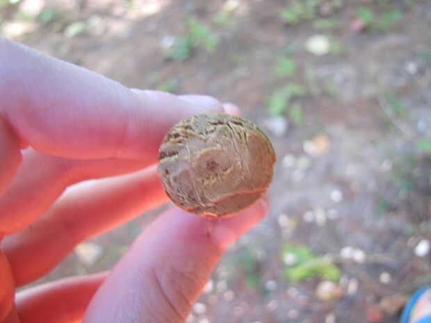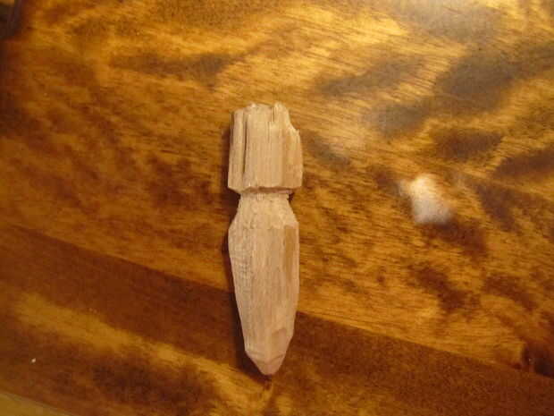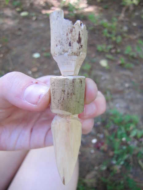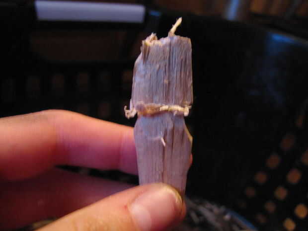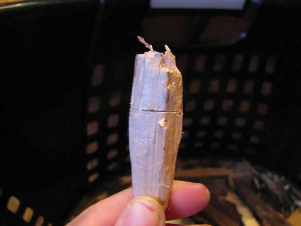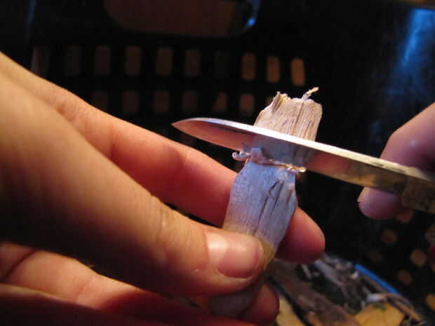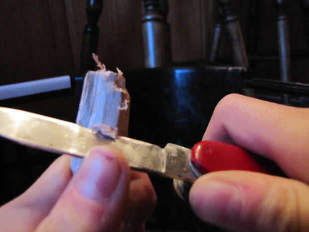 A continuación, haga un 3/4 de pulgada profundo va alrededor de la circunferencia de la pieza de madera a 2 1/2 pulgadas desde la punta inferior. Proceder al corte alrededor de la ranura con trazos hacia arriba hasta que usted ha creado un surco oblicuo que se detiene en el corte. Toma su cuchillo y corte hacia abajo para quitar las virutas de madera extra. No tire los chips ya que no saldrá limpiamos. Cuando haya terminado, usted debe tener algo que parece en la última foto.
