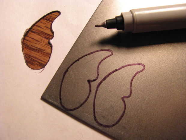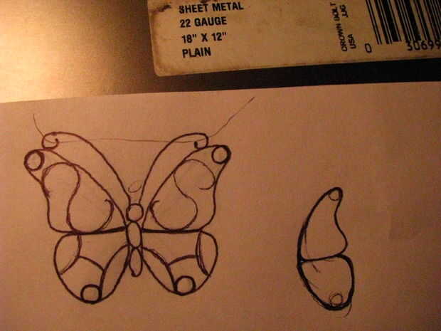 Para un paso a paso instructivo haga clic aquí.Las alas comenzaron como una pulgada cuadrada de chapa calibre 22. Las antenas son un clip de papel. El cuerpo se forma de un clavo de madera.Alas de la mariposa tienen tantas formas diferentes. Después