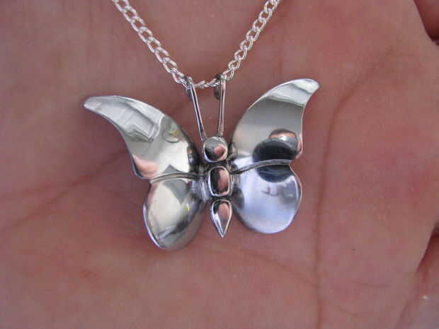 este colgante está hecho a mano con el uso de las mediciones. Significado, comienza dibujar lo que quieras y tome directamente al metal. Esta investigación me di cuenta alas de la mariposa tienen muchas formas diferentes. Después de mirar un montón,