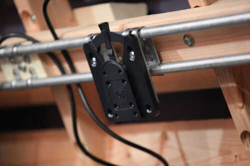 con los carriles conducto hacia arriba y los ganchos conectados a la placa, la placa trasera encajan perfectamente en los rieles. el perno que sobresale en la parte trasera permitida la placa de fijarse a los carriles mientras que le permite deslizarse libremente a lo largo de los rieles.