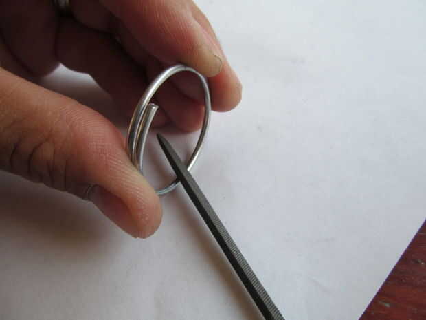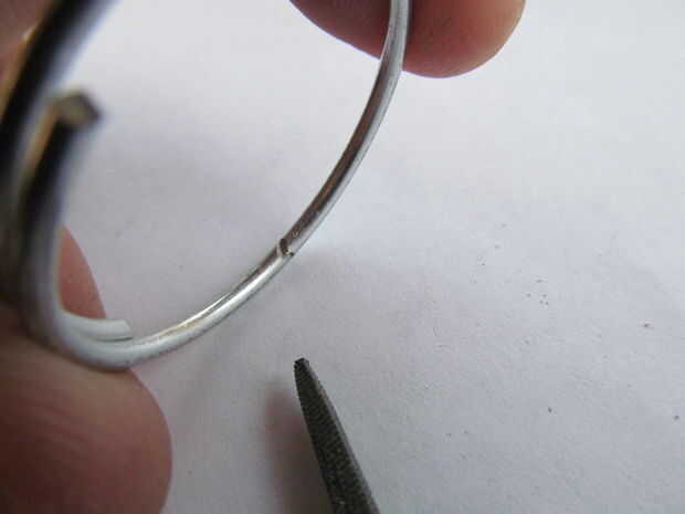 Cuando llegue el momento de doblar en el colgante, no será en línea recta. Para obtener el desplazamiento correcto tienes que archivo en las muescas en ángulo. No mido, pero mi conjetura entre 45 y 90 grados. Usé un archivo cuadrado una muesca cerca de 3/4 del camino en el cable.