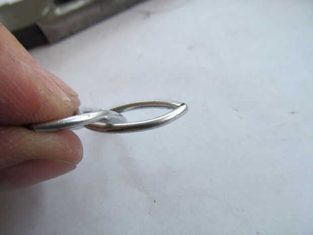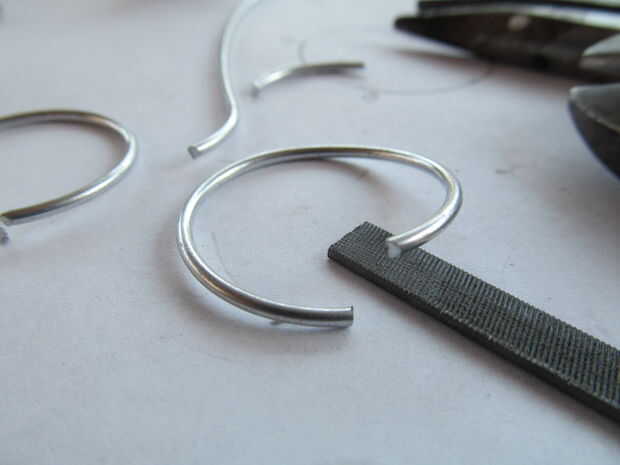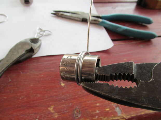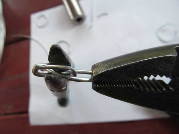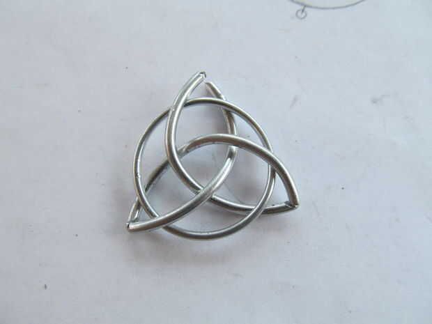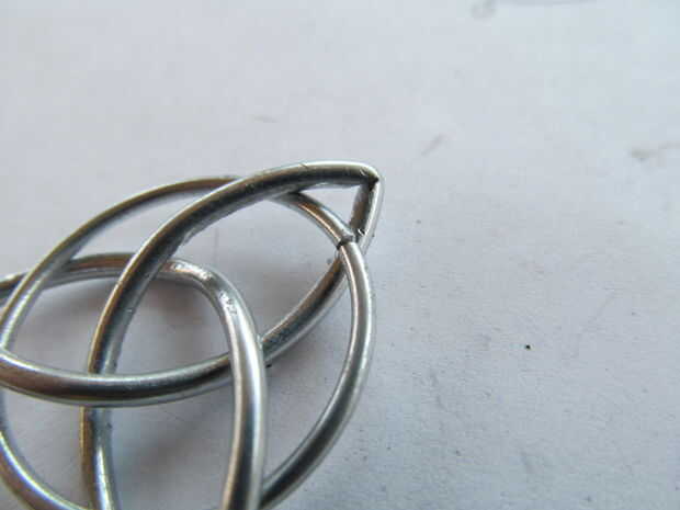 El círculo se forma con el mismo método de toma y pinzas. Este cable es de calibre 16 que es sólo un poco más delgado que el calibre 14. Después de cortar una, presentar los extremos por lo que conocen muy bien. Yo un poco para abrir el camino para roscar el círculo trenzado cada parte del trébol. La Junta se esconde detrás de uno de los arcos.