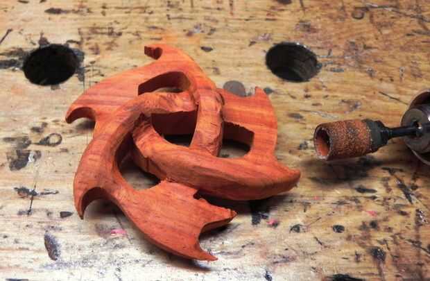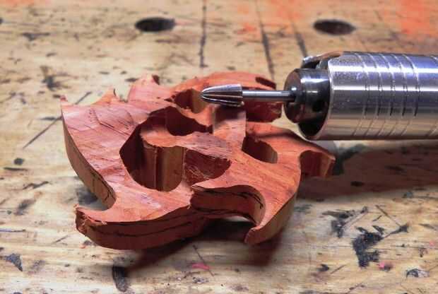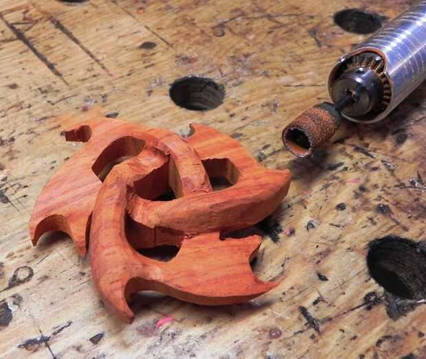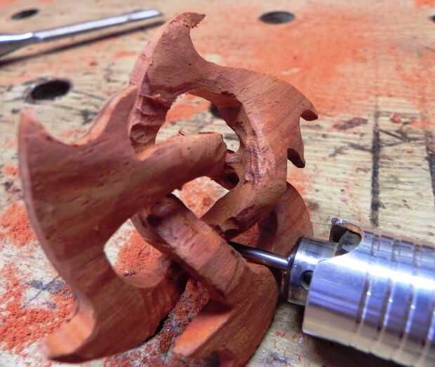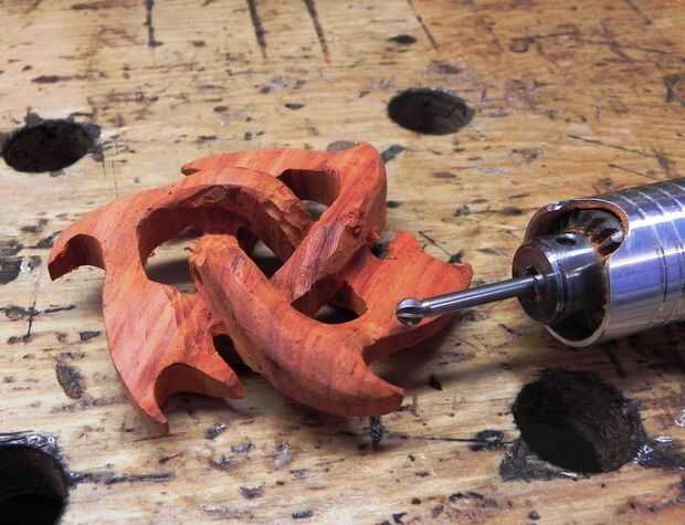 Con la fresa redonda, comienzan a tallar debajo de los crossovers pero deja un trozo pequeño en cada uno intacto para la fuerza. Vamos a usar el cortador fino más tarde a les.