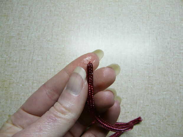 Pegar los extremos funciona mejor que el de fusión en este caso, porque el pegamento hace una sección corta del cable rígido, y que resulta más fácil tejer el extremo hacia adentro y hacia afuera mientras creas el nudo.
