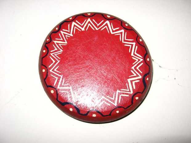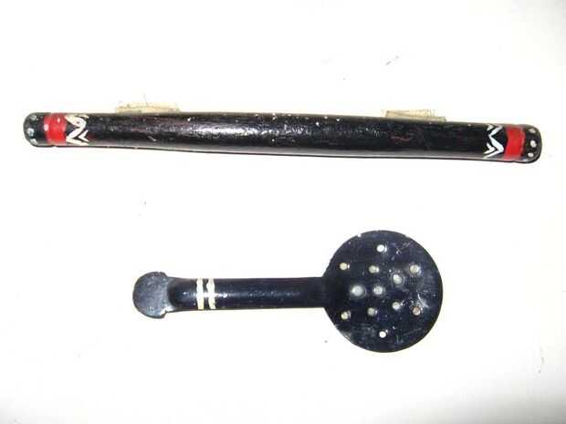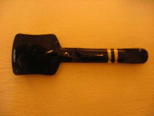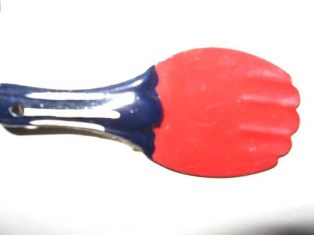 b) cuchara metálica (para servir arroz) pintadas con pinturas rojo, de blanco y negro (Snap-4)