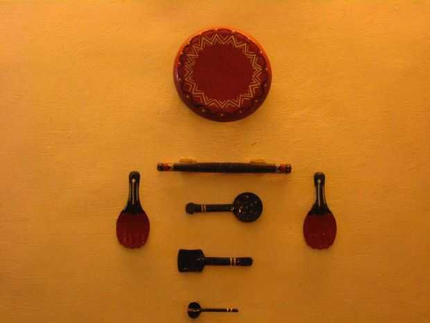 3) un) rodillo de madera (para el pan del balanceo) y espátula metálica para freír se pintan con negro, rojo, blanco (Snap-3)