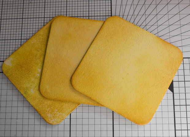 Arrastre sus posavasos a través de la tinta para cubrir de color, hice ambos lados de la mina con la tinta de la semilla de mostaza. Utilizando un aplicador de la tinta o maquillaje esponja ir alrededor del borde de cada posavasos con una tinta más oscura, no tiene que ser el mismo completamente redondo, variedad añade interés.
