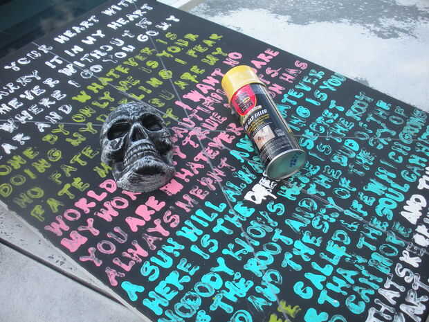 Tenía una lona había rescatado de la banqueta pero podría utilizar cualquier un pedazo de madera contrachapada o una tienda compraron piedra sepulcral de espuma de poliestireno o lo que sea, desde el gabinete de pintura una lata de blanco y uno de pintura naranja fluorescente, de los varios de la caja un cráneo medio de tienda de dólar y una poder de expansión de espuma (este material es un material de sueño casa haunters)