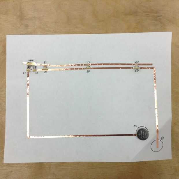 Ahora, toma la cinta de cobre y empezar a crear tu URL + y -. Poner las pegatinas de LED y la etiqueta engomada del módulo de sonido activado en el circuito también. Para probar, inserte la batería y complete el circuito. Cuando hay cualquier sonidos cerca del módulo, deberá encenderse el LED y su brillo debe ser dependiente en el volumen del sonido. Así, por ejemplo, se trata de cómo probé el circuito. Una fuerte explosión en la mesa deberá encenderse los LEDs bastante brillantes mientras que un toque más suave debe producir una luz más débil.