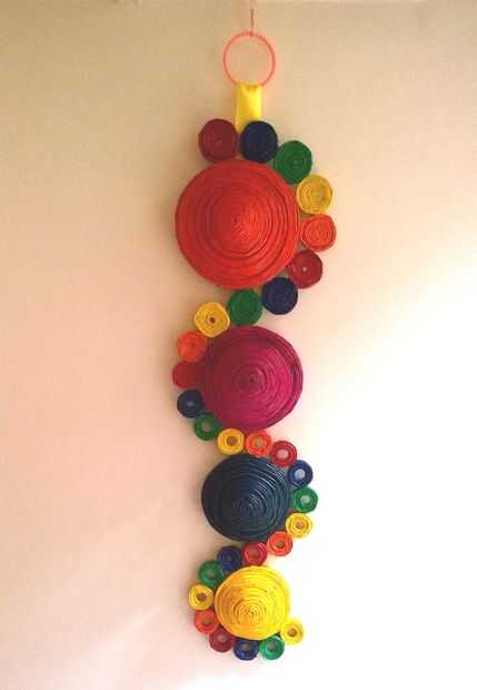 Colgante de 4 círculos consiste en periódicos de toda la página 20. Estos periódicos se enrollan para formar 'tubos de papel'. Tuberías deben girar en círculo de forma a forma de espiral. Una vez que estos círculos están listos, están pintadas en colores brillantes. Usando la pistola de pegamento caliente, se pegan entre sí. Hay diversas formas que se pueden realizar fuera de estos círculos de periódico.