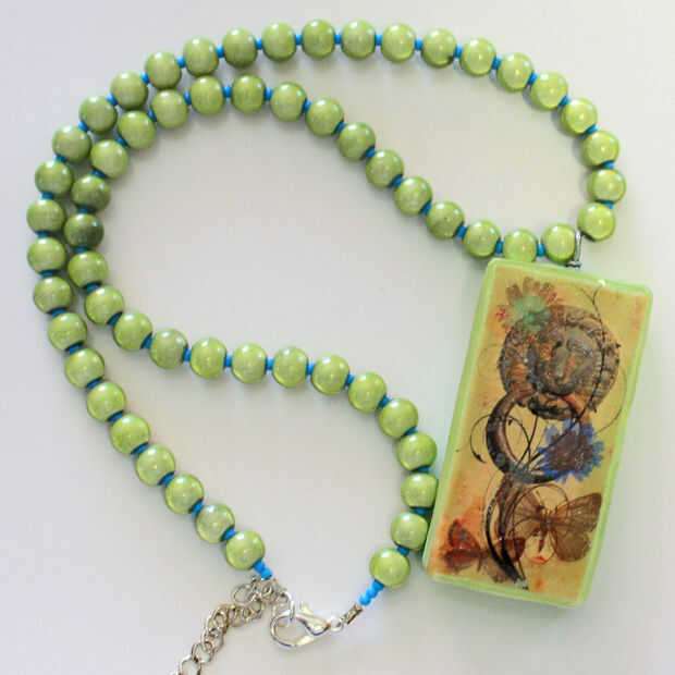 El acabado es 1 x 2 pulgadas. Puede hacer un colgante en cualquier forma o tamaño que desee. Usé perlas delica azul con cuentas verdes para llevar a cabo la flor azul en la gráfica de la pendiente.