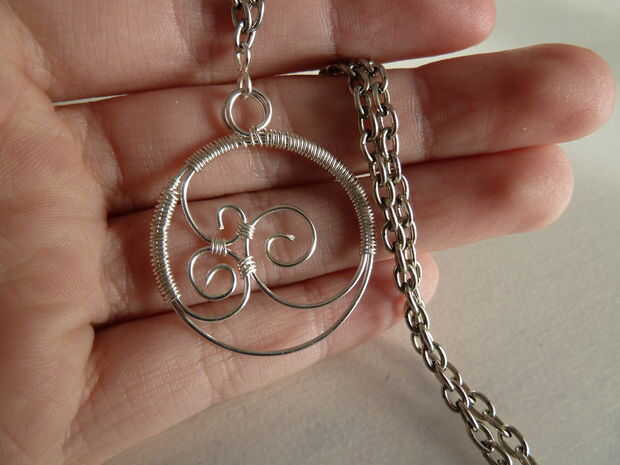 Este tutorial te enseña cómo hacer un colgante intrincadamente envuelto con remolinos bandas de alambre tejido en la parte delantera.Puede tejer la delantera en casi cualquier patrón que desee. Instrucciones para el diseño se muestra aquí como una su