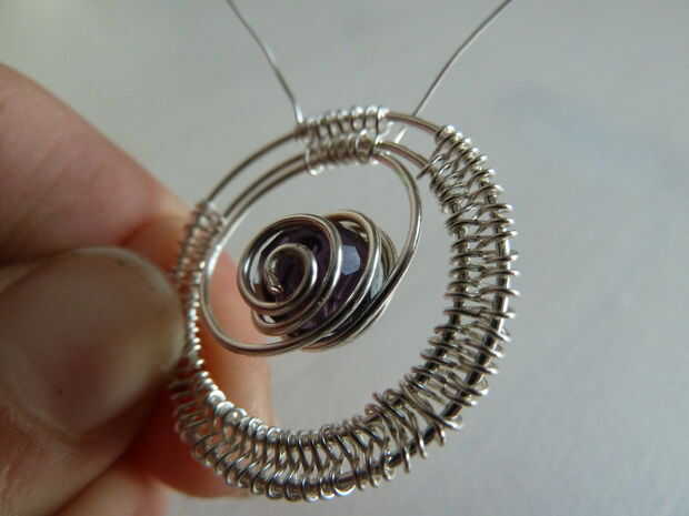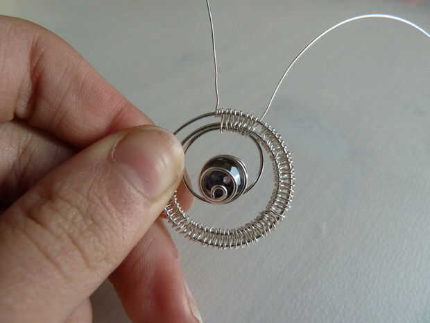 Después de envolver un poco de alambre, echó un vistazo en el colgante y decidida no me gustó el aspecto del grano aún. Tomé el extremo del alambre que se utiliza para establecer la cuenta y le dio un poco de un remolino.