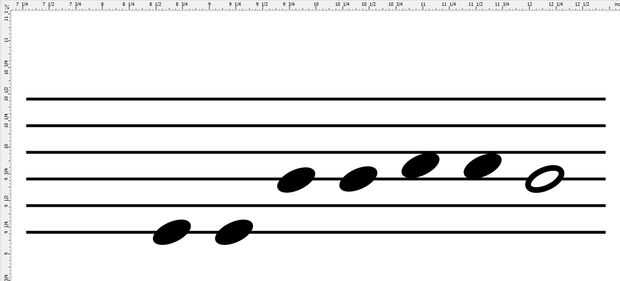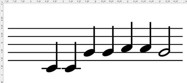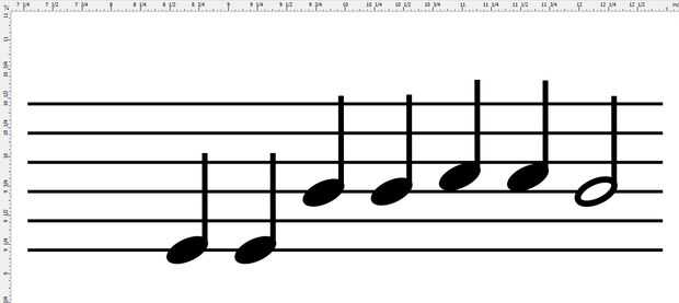 Cada nota consta de un vástago y una cabeza de nota. La cabeza es la parte elíptica de la nota, que es fácil de crear con un óvalo rotado. Con ensayo y error, dibujó óvalos y girar hasta que uno miraba sobre derecho. Un óvalo un poco más de la mitad de la altura de la distancia entre el personal de líneas y gira a 25 grados funcionó bien. Hice seis copias de la cabeza y había colocado en su ubicación aproximada. Entonces usando la función de alinear y distribuir los espaciados igualmente separados horizontalmente. Esto funcionó hacia fuera a ser aproximadamente a 0,6" centro a centro. Entonces retocaron su posición centrado entre las líneas según corresponda o ajustándolos a la línea de personal. Las seis primeras notas son negras por lo que tuvieran que ser llenado sólido, y dejé la nota final abierto ya que es una nota de media.