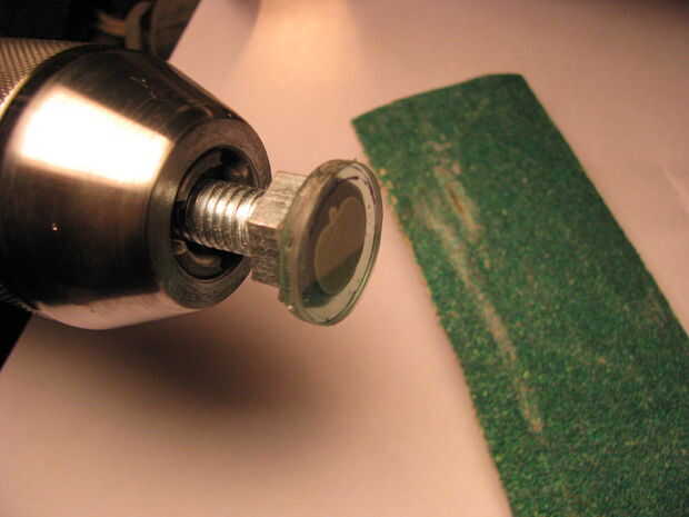 Monte un tornillo en una prensa del taladro. Agregado el círculo áspero con un pedazo de cinta doble cara a la cabeza del perno. Vuelta redonda y utilizar papel de lija para limpiar los bordes.