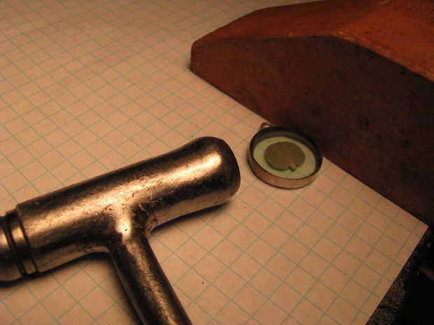 Lugar el recuerdo en la tapa. Martillo el borde de la tapa en un ángulo de 45 grados por lo que vuelca en el recuerdo. Tendrás la tapa del extremo en una esquina. Utilicé una pinza en un banco de trabajo.