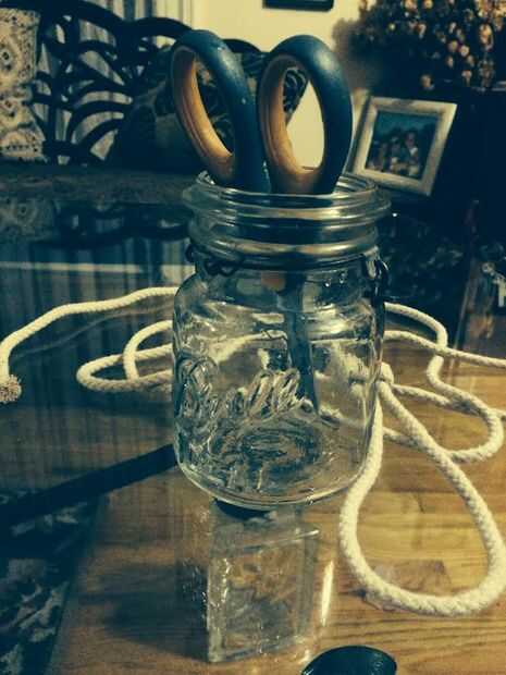 la jarra de bola de alambre, tijeras, cuerda a mano y una planta de cortes