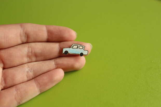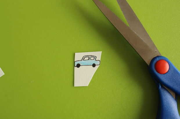 Use sus tijeras para cortar cuidadosamente el coche. La parte más delicada es la parte debajo del coche, este es también donde todavía muestra una línea delgada de papel blanco debajo del coche en mi versión.