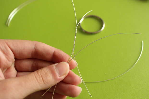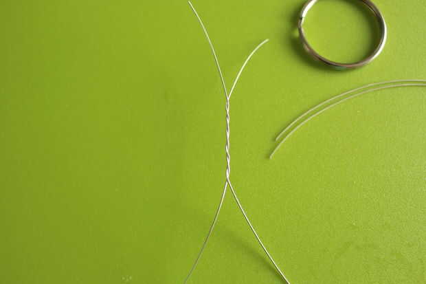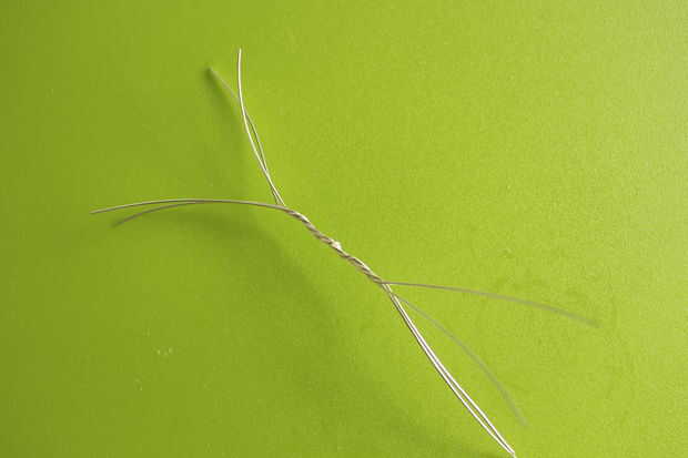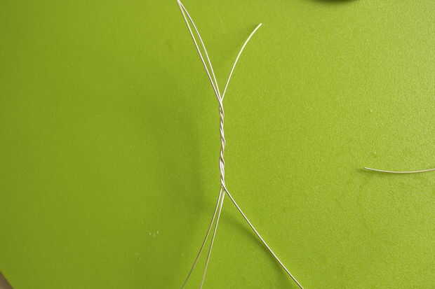 Tomar dos cables y girar juntos. Añadir un tercer alambre girando alrededor de la parte que acaba de crear. Hacer lo mismo para agregar alambre número cuatro. Dividir los cables hacia fuera en dos pares en uno de los lados.