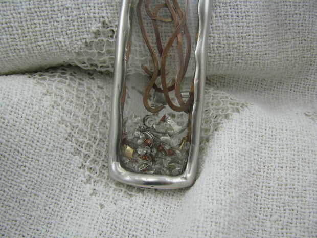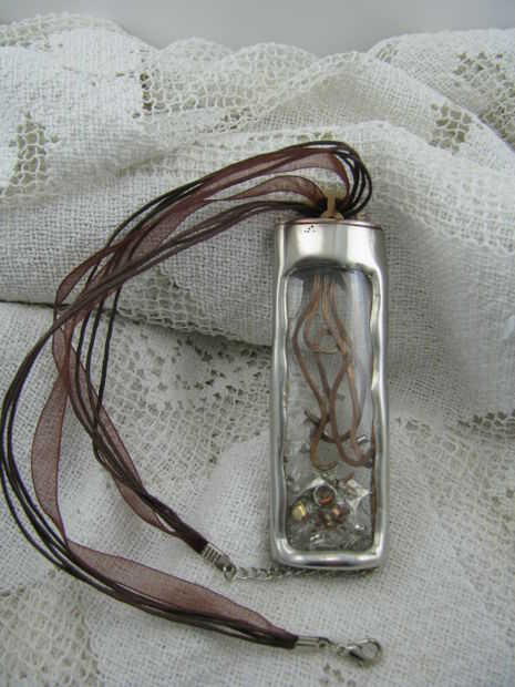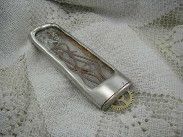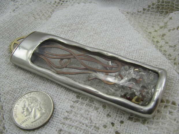 este colgante inspirado steampunk y vintage está hecho de un azulejo de vidrio alterado de la tienda de mejoras para el hogar. El azulejo fue pintado con pinturas acrílicas rojizas, rosas y naranja. La antigua imagen clave es caucho sellado en el col