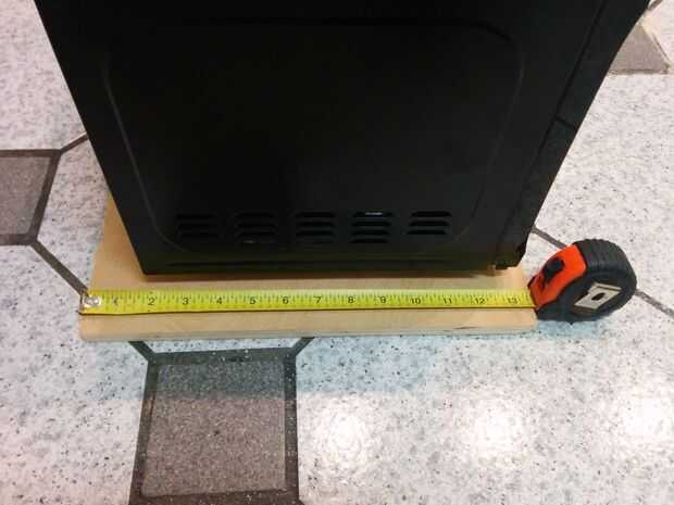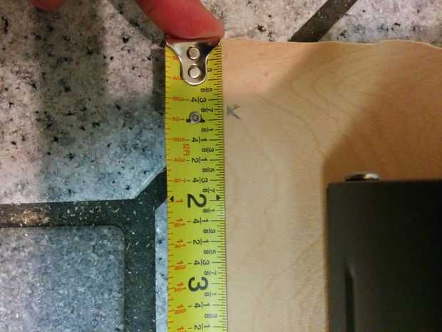 Ahora, establezca su tablero de madera contrachapada y poner el horno de microondas en él en la misma posición que va a estar en cuando se cuelga para arriba. Entonces use la cinta métrica para marcar las ubicaciones de agujero a bordo con un lápiz. Repita para el otro lado. Pongo mis agujeros aproximadamente una pulgada desde el borde, pero en retrospectiva, habría coloqué mis agujeros un poco más. Usted verá por qué en el último paso.