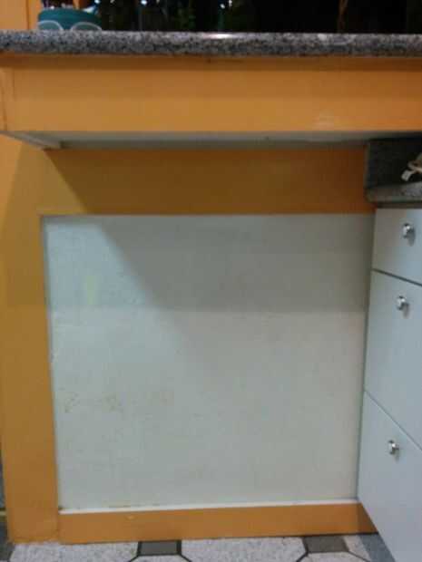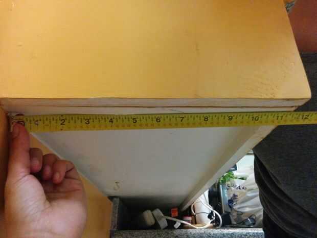 Ahora es necesario medir la parte inferior del contador/armario donde vas a colgar el estante para que usted puede averiguar la colocación adecuada de los agujeros para las monturas de soporte colgante (gancho, perno, arandelas) en el tablero de madera contrachapada. Estimado que quería mis agujeros para centrarse en el 1" y 9.5" de la pared.