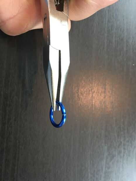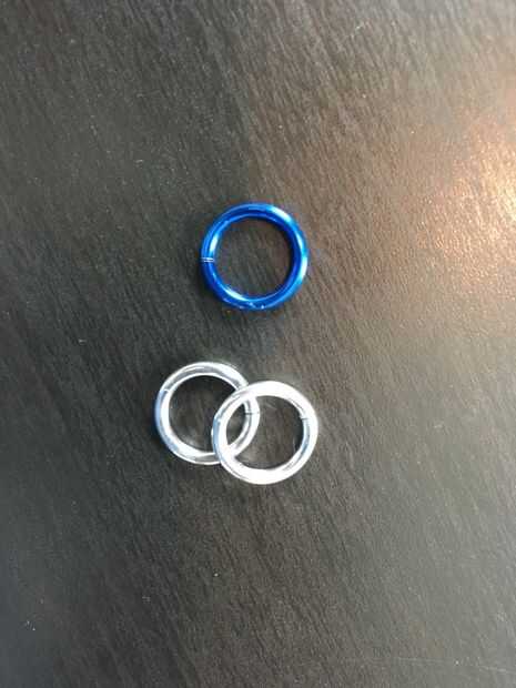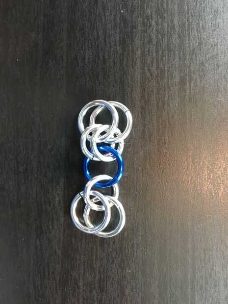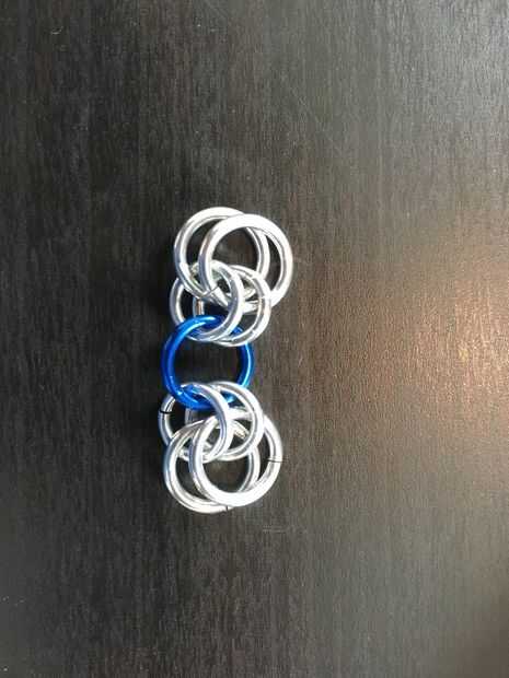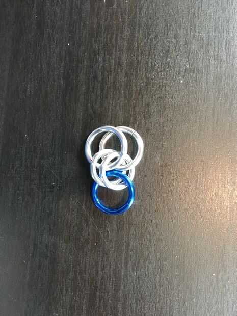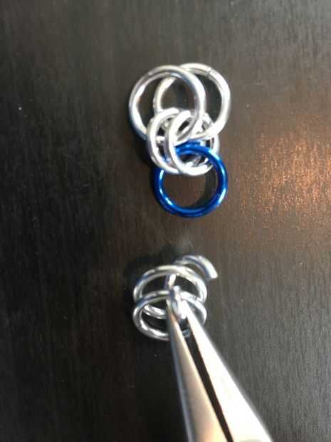 Comenzar por el cierre de uno de los anillos de acento de gran diámetro y dos de los anillos regulares de gran diámetro. Uno de los anillos de diámetro medio y poner estos anillos en él. Luego agregar un segundo anillo de diámetro medio a través de la misma manera. Si se hace correctamente, esto le dejará con una unidad como la 4ta imagen.