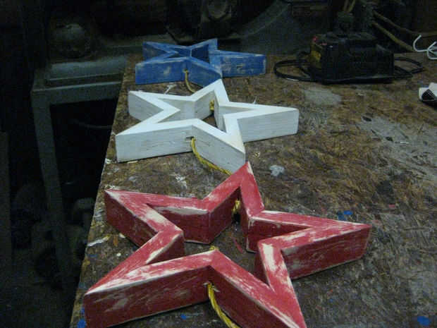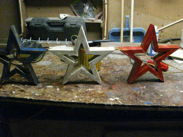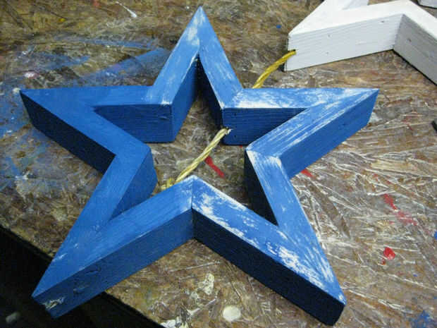 Último paso, estrellas de arena hasta que el grano de madera comienza a mostrar. Mancha de las estrellas y la poli ellos para arriba. Coloque la cuerda en el medio y colgar em.