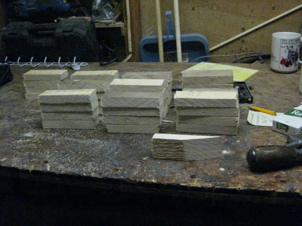 Cortar la madera arrancó a 4 1/2". Estos deben ser todos tener la misma longitud o las estrellas no se van de la mano. Pongo un bloque de tope en mi sierra de mesa para mantener los recortes de la misma. Usted necesitará 30 pedazos, siempre más, corte para madera mala, o errores.