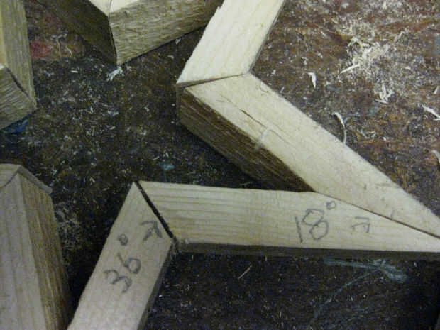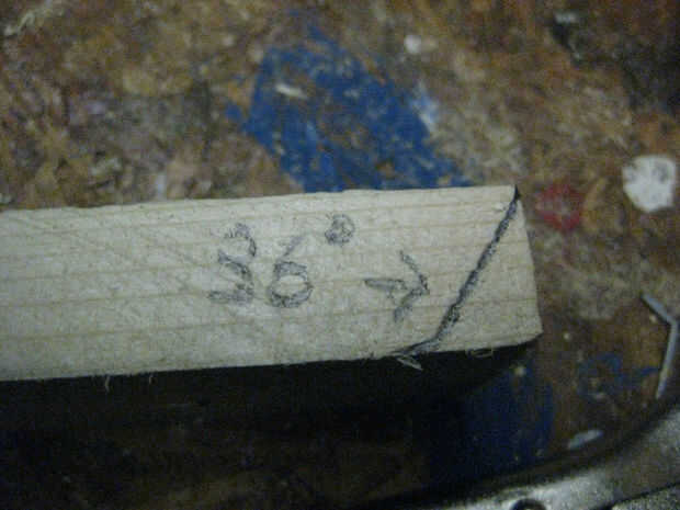 Ahora corte el ángulo de 36 grados. Otra vez con el reloj sus cosas de los dedos. Acaba de celebrar las piezas para estos cortes. Poner una parada en su sierra, los cortes (ver fotos) desde el extremo cuadrado de las piezas. Un poco difícil mantener los ángulos de las mismas. Sólo consiguen el primero derecho y utilizarla como patrón. Los ángulos de espejo, no enfrente.