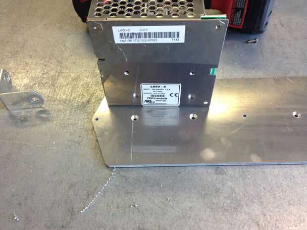 Después se instalaron los soportes en ángulo hemos añadido la electrónica placas de montaje. Un problema menor con el diseño que teníamos que instalar el poder suministra sobre las placas de montaje antes de montar la placa a la estructura. Utilizado pernos avellanados para fijar la PSU y había atado el conjunto a la columna vertebral.