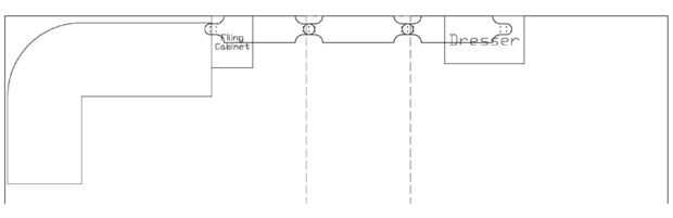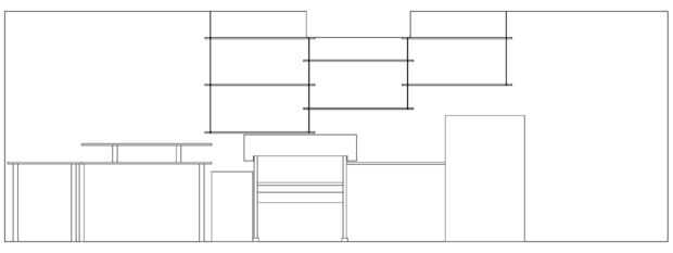 Dibujaba mis planes en AutoCAD y ha incluido fotos de ellos. En él puedes ver mi escritorio, archivador y otros muebles que se encuentra a lo largo de la pared que cuelga los estantes contra. Por encima de ellos, puedes ver los estantes ellos mismos. También se puede ver la sección caída de techo encima de donde se montar los estantes. Más sobre esto más adelante.