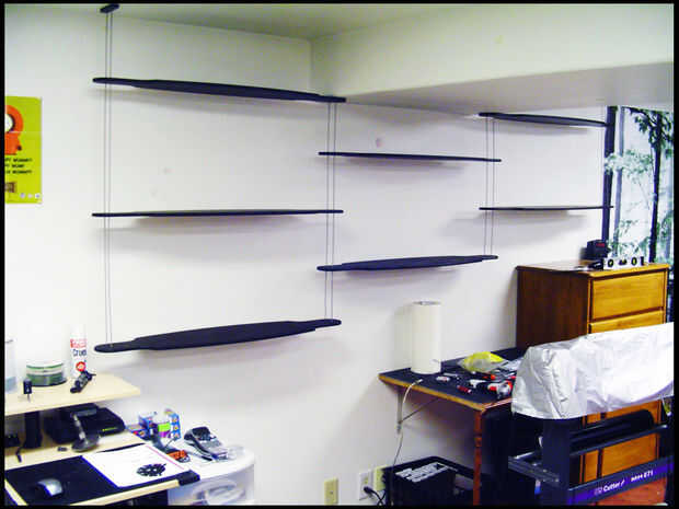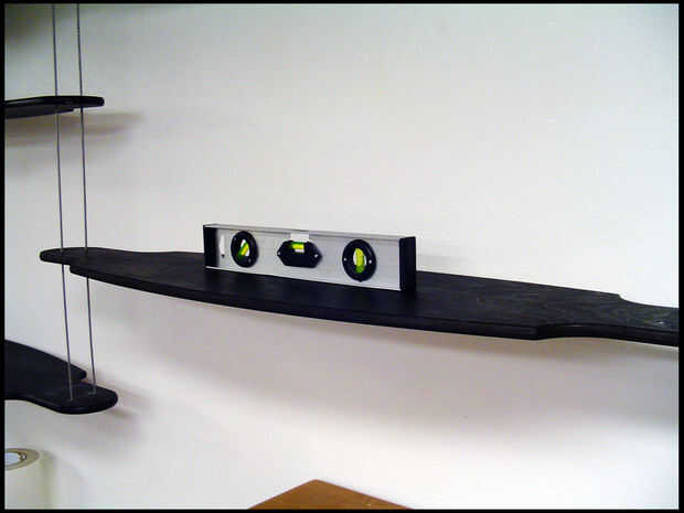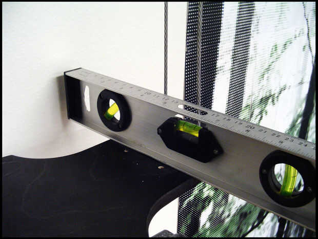 Con los cables colgados, es hora de montar los estantes. Tener una segunda persona, es de gran ayuda. Empezar por marca en el cable donde quieras los estantes, midiendo desde la parte superior hacia abajo. Puede marcar un estante en un momento y marcar el próximo después de anterior se cuelga o marcarlos todos hacia fuera primero.