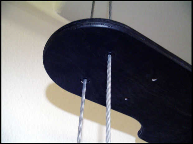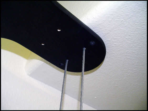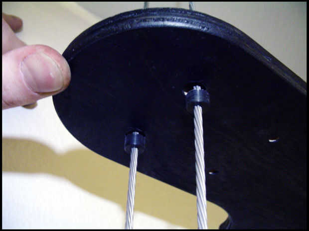 Coloque el primer estante sobre los cables y que alguien se mantenga por encima de las mejores marcas. Deslice un collar en cada cable y apretar en sus marcas y deje la plataforma sentarse en ellos. Que tendrás que guiar los collares en sus orificios.