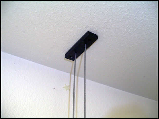 Luego vino los bloques de montaje en cada extremo. Montado en ellos la misma manera como lo hice con los extremos opuesto de la plataforma; dos tornillos en las vigas del techo. Una vez más, pase los cables a través de antes de montarlos. También asegúrese de montar en el espacio correcto para alinearse con los agujeros en sus estantes.