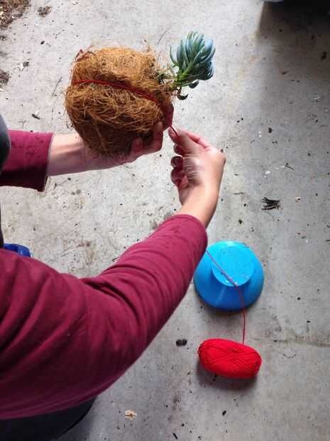 A continuación un nudo para terminar el hilo dejando suficiente hilo para permitir que la maceta colgar. Tomar el otro extremo de la cadena y encontrar el deseado centro de gravedad antes de atar el otro extremo de la cuerda de colgante.