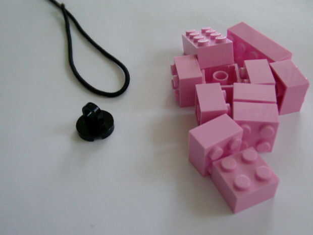 Para hacer un colgante inicial de Lego, se necesita: -algunos ladrillos -un 2 x 2 redondo pieza con un lazo en la parte superior (ver segunda foto para un primer plano) -un cordón o cadena -hoja de fuente encontrada en