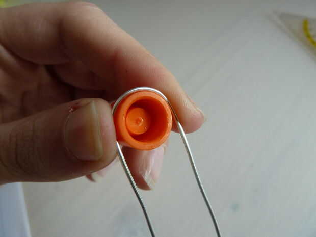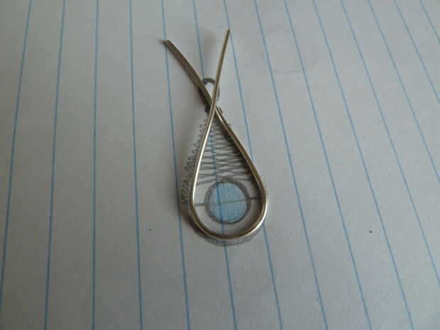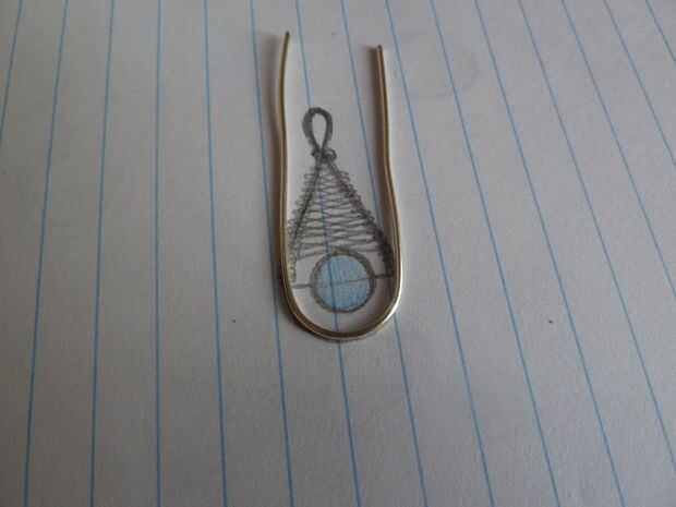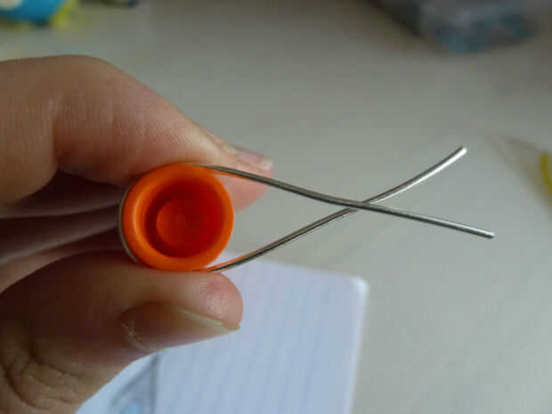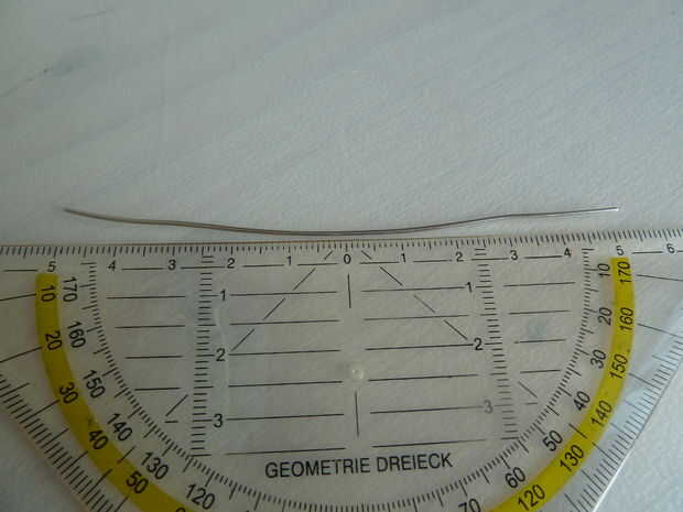 Cortar un trozo de su alambre de 1 mm con una longitud de unos 10 cm. encontrar el centro y la curva alrededor de tu objeto redondo. Mantener doblado hasta llegar a una forma de 'U'. Enderezar el alambre no todavía doblado lo mejor posible antes de doblar aún más. Deje que los cables de cruzar y seguir doblando hasta llegar al ángulo que se muestra en las últimas fotos (es 45 grados).