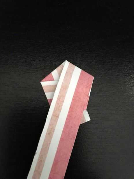 Ahora toma el extremo más largo del papel (no el extremo donde usted simplemente atado un nudo!) y doblar hacia abajo por lo que está tocando las dos esquinas, formando una forma de Pentágono.