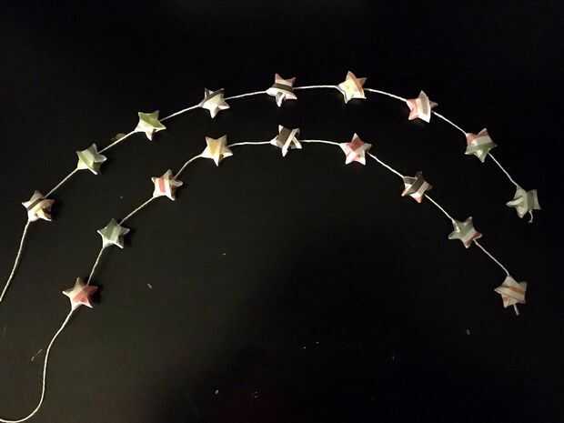 El resto de las estrellas de la secuencia. Añadir un poco de pegamento en el agujero de la estrella (aish nose otra manera decirlo) si no quedarse. Si lo desea, haga un nudo en un extremo de la cuerda y corte el exceso de cordel. Y ya está! Uh, espere hasta la cola seca y listo! Colgar en el techo, la pared, el abrigo alrededor de cosas, etc.. Este DIY se basa en colgar 1.000 grullas de papel!